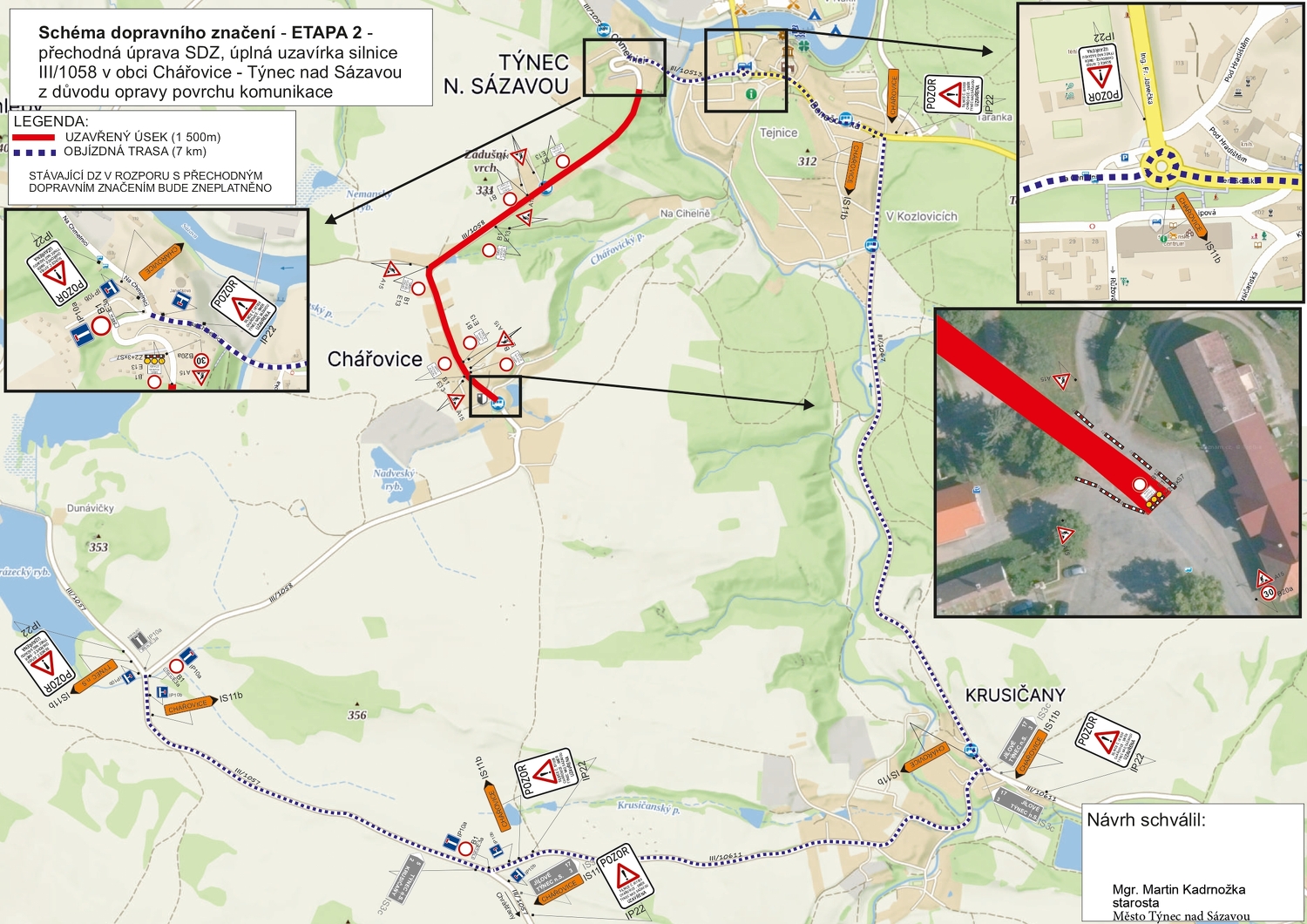 V průběhu realizace bude komunikace v dotčeném úseku uzavřena. Objízdné trasy jsou vyznačeny přechodným dopravním značením. Žádáme řidiče o respektování dopravního značení, zvýšenou opatrnost a trpělivost při průjezdu na objízdných komunikacích.