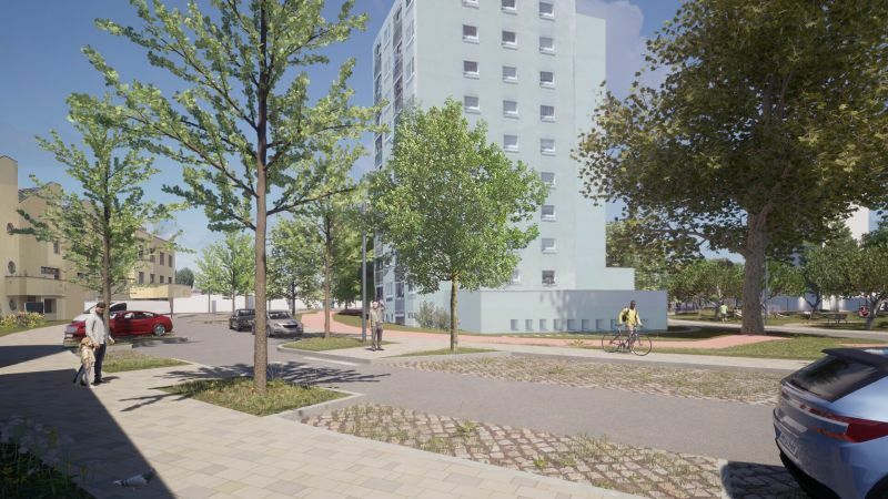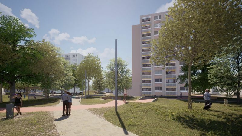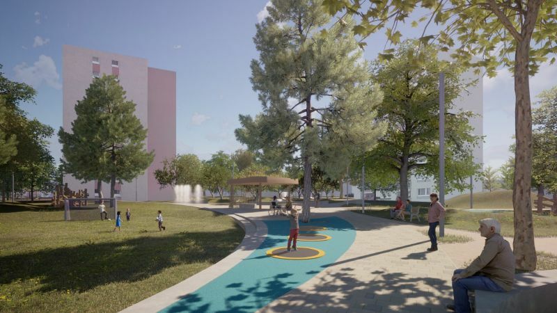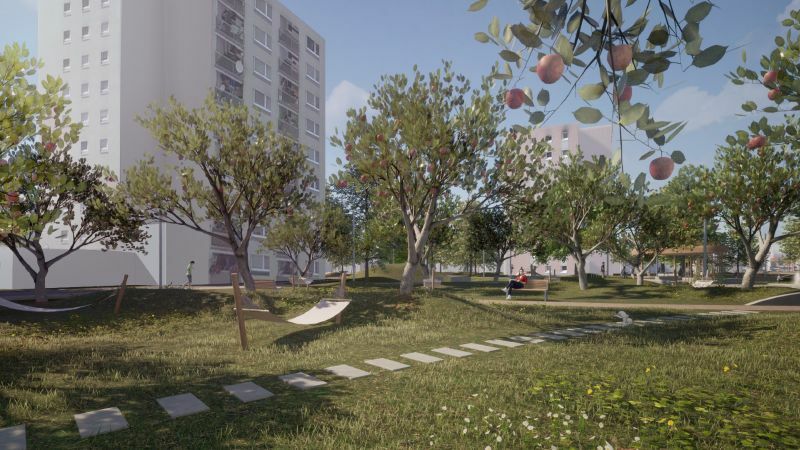 Co vše tedy můžeme v tomto prostoru očekávat? Vznikne nová zeleň, altán se zelenou střechou, vodní prvky (pítka, fontánka), retenční nádrž, zasakování dešťové vody přímo v místě, zpevněná dráha např. na in-line brusle, sad pro odpočinek s lehátky a lavičkami, herní prvky pro děti a mládež, ohniště, nové cesty, parkovací místa, stanoviště na tříděný a komunální odpad. Důležité budou terénní úpravy, tak aby obyvatelé panelových domů nebyli rušeni hlukem z prostranství.