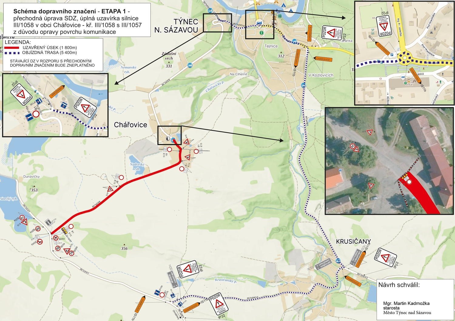 V průběhu realizace bude komunikace v dotčeném úseku uzavřena. Objízdné trasy jsou vyznačeny přechodným dopravním značením. Žádáme řidiče o respektování dopravního značení, zvýšenou opatrnost a trpělivost při průjezdu na objízdných komunikacích.